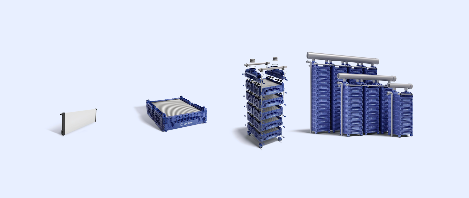 The cerafiltec system offers modular scalability designed to meet any capacity requirement. It starts with individual ceramic plates featuring double-sided water outlets, which are housed in filtration modules containing up to 34 interchangeable units. These modules stack to form a single filtration tower (up to 16 modules high). For large-scale operations, multiple towers are integrated into a multi-tower configuration connected via a central header pipe, allowing for seamless industrial expansion.